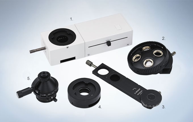 旋转载物台安装的旋转对中装置能够顺畅地旋转标本。此外,为了实施精确测量,每隔45度就有一个咔哒停止装置。如果增加了双机械载物台,还可以进一步完成X-Y的微小移动。