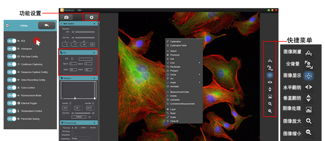 **友好交互设计方案,特别设置独立功能处理单元,用户可根据不同应用定制专属工作界面,包括图像拍摄、图像处理、图像测量等多个功能模块,功能定义更清晰,操作更流畅!